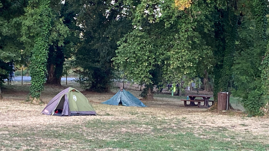 Am Ende entschied ich mich für den „Camping municipal“ in Sourzac, sechs Kilometer vor meinem eigentlichen Ziel. Ein Ort ohne Laden, ohne Café, ohne Restaurant – aber mit herrlich heißen Duschen, frischem Trinkwasser und einem besonderen Geschenk: einem Zeltnachbarn aus den Niederlanden, ebenfalls als Pilger unterwegs, allerdings auf zwei Rädern.