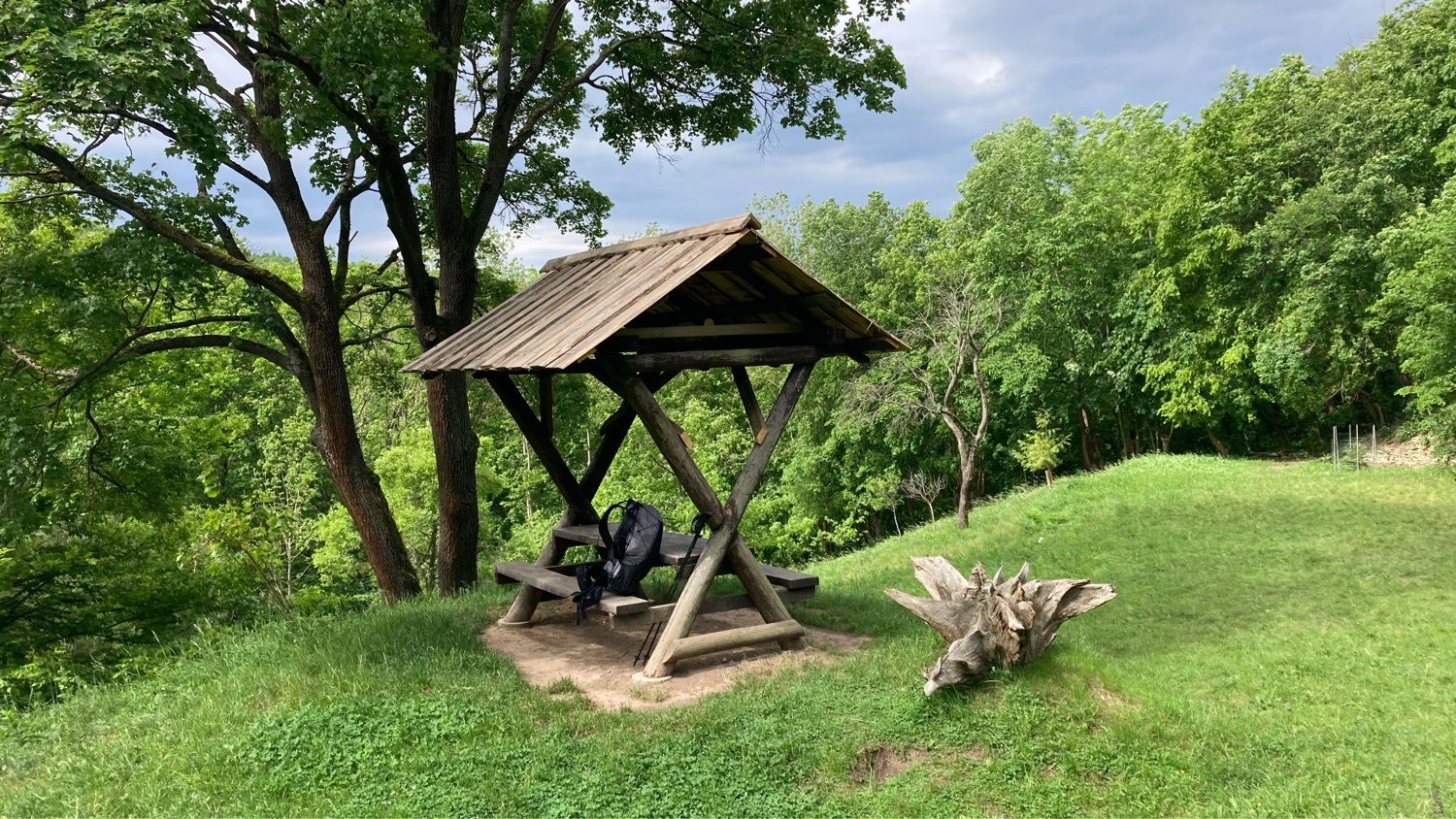 Beim Frühstück erzählte mir der Herbergsbetreuer, dass der Weg über die Eisenbahnbrücke hinter Naumburg gesperrt sei. Um meinen geplanten Weg fortsetzen zu können, ließ ich die Navigations-App Komoot eine alternative Route berechnen. Diese führte mich diesseits der Saale nach Bad Kösen und schließlich auf den Jakobsweg. Rückblickend bereue ich diesen Alternativweg nicht im Geringsten. Er entpuppte sich als wunderschöner Pfad, der über einen Berg durch dichten Wald und schließlich über den Galgenberg führte, der Teil des Kurparks und der Streuobstwiesen von Bad Kösen ist.