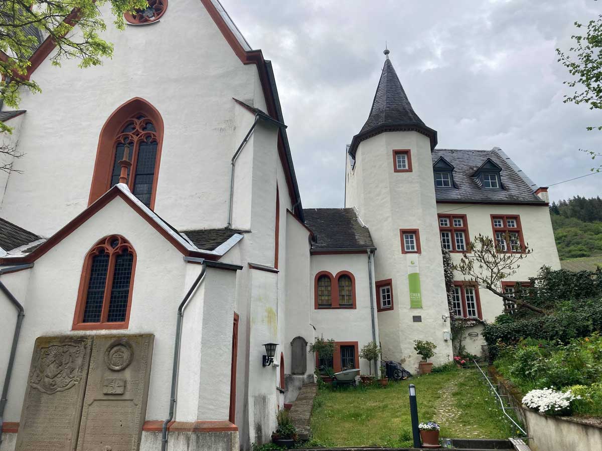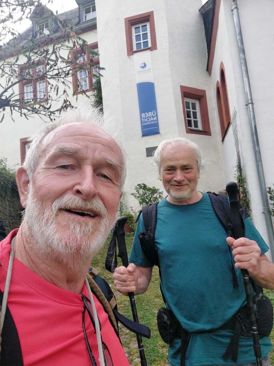 Am Zielort, der alten Lateinschule, angekommen, erwartete mich eine freudige Überraschung: Pilger Alfonz saß im Garten und begrüßte mich mit einer kalten Flasche Bier. Es war schön, ihn wiederzusehen, doch erzählte er mir leider auch, dass er den Mosel-Camino wegen einer Knieverletzung aufgeben musste. Besonders die steilen Abstiege bereiteten ihm Probleme, sodass er einen Teil der Strecke mit dem Bus zurückgelegt hatte.