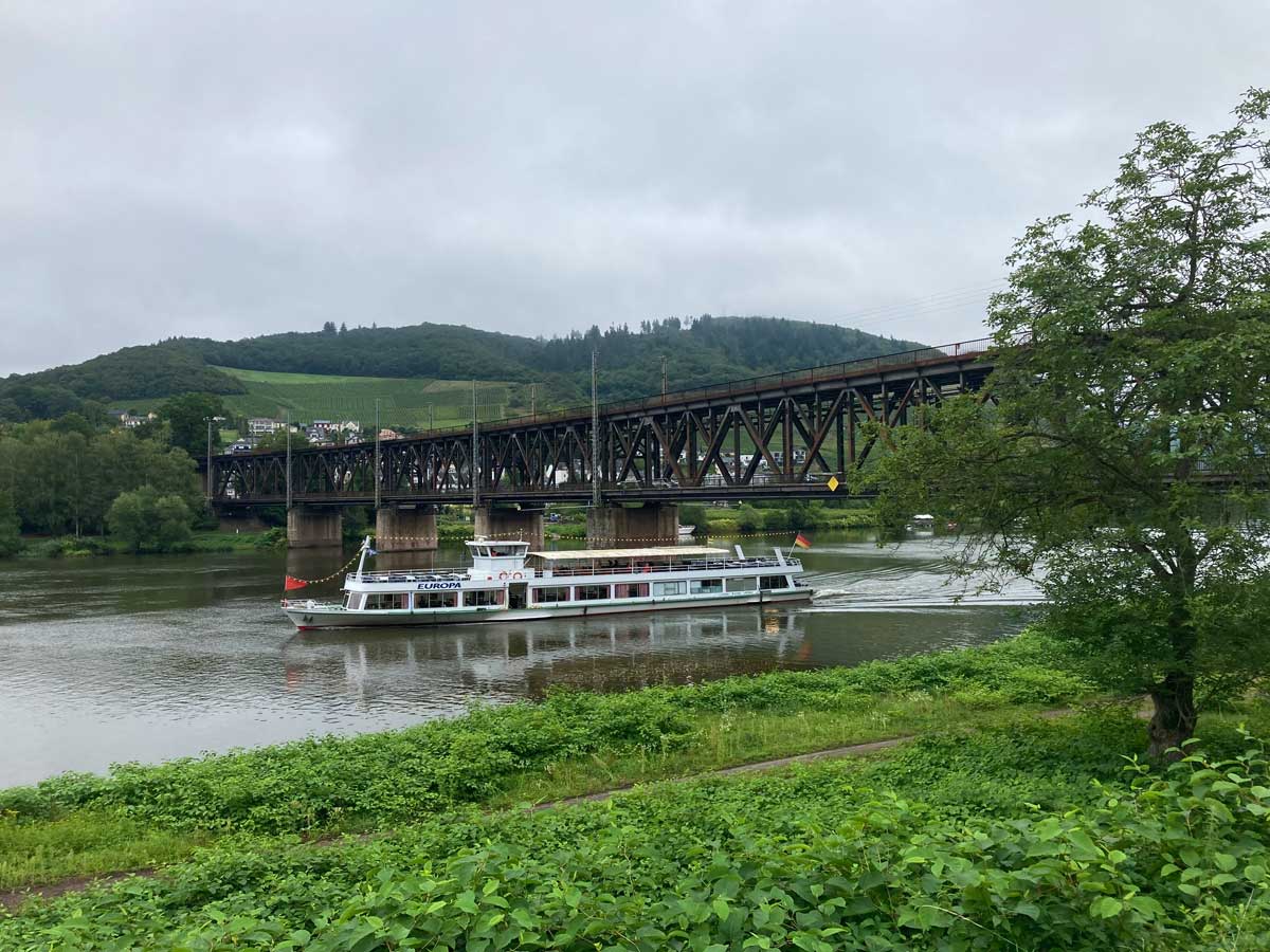 Nach einem wohlverdienten Ruhetag in Bullay begann der nächste Abschnitt meiner Reise mit einem Highlight: dem Überqueren der ersten deutschen Doppelstockbrücke. Schon bald führte der Weg hinauf zur Marienburg, von wo aus ich mit einer atemberaubenden Aussicht belohnt wurde. Der sanfte Abstieg nach Zell bot Gelegenheit, die Landschaft und gelegendlichen Sonnenstrahlen in vollen Zügen zu genießen.