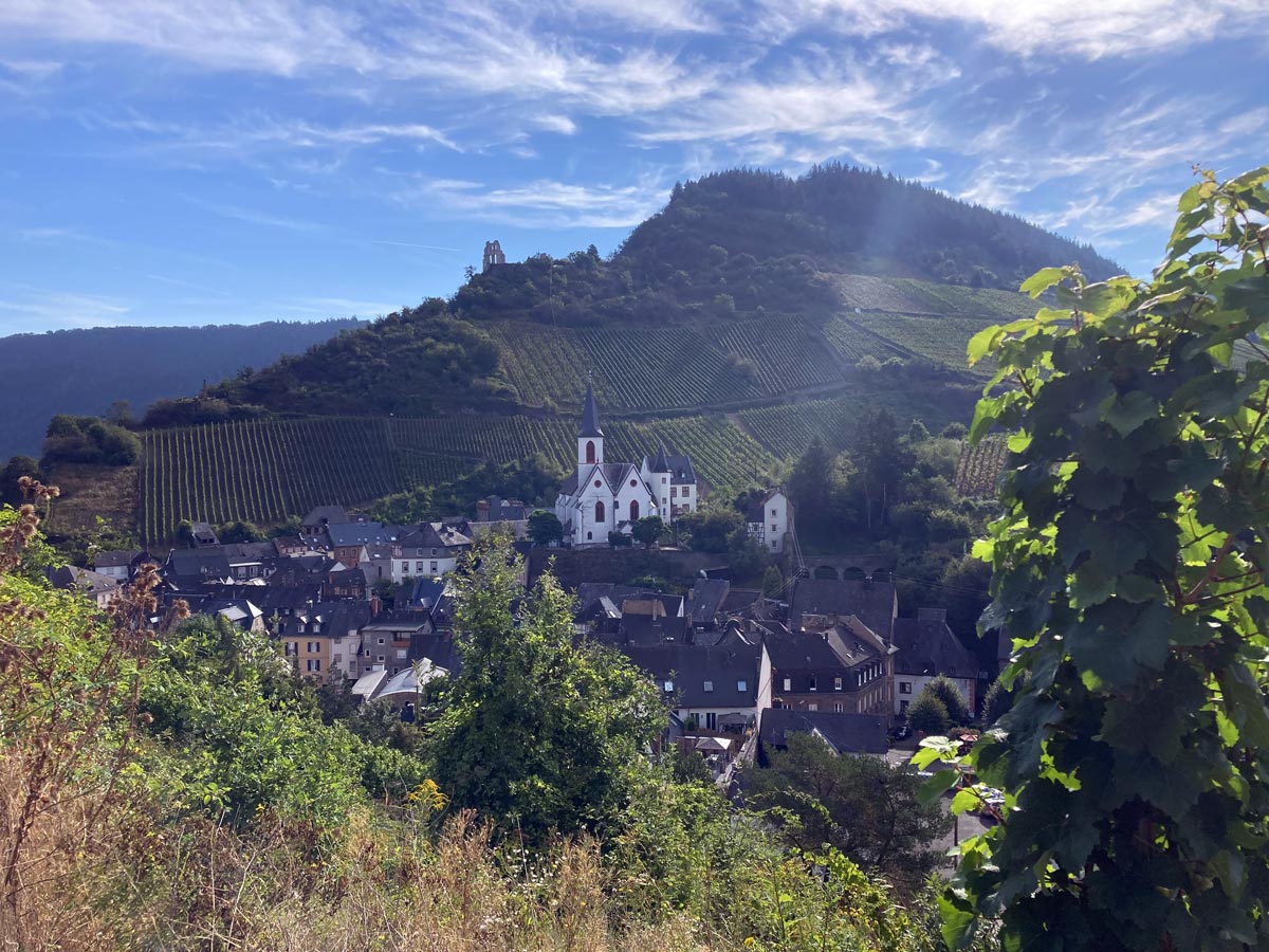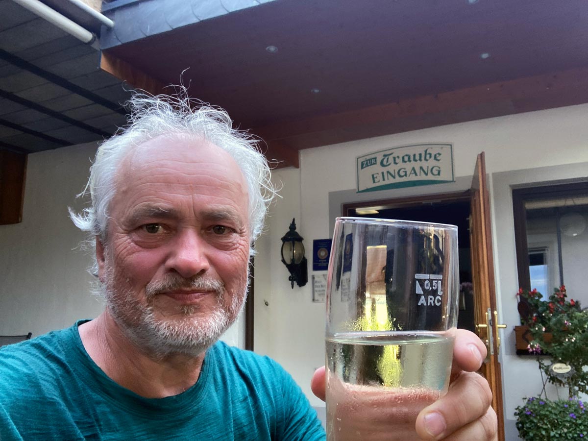 Schließlich führten mich verschlungene Pfade durch die Weinfelder und Streuobstwiesen am Berghang hinauf bis zu meinem Tagesziel, dem Gasthof „Zur Traube“ in Osann-Monzel. Hier, inmitten des kleinen Weinortes, fand ich nicht nur ein gemütliches Zimmer, sondern auch eine herzliche Gastfreundschaft. Der Gasthof, der neben seiner Rolle als Restaurant auch im Weinbau tätig ist, bot die perfekte Gelegenheit, den Tag mit einem ausgezeichneten Essen und reichlich Weinschorle stimmungsvoll ausklingen zu lassen.