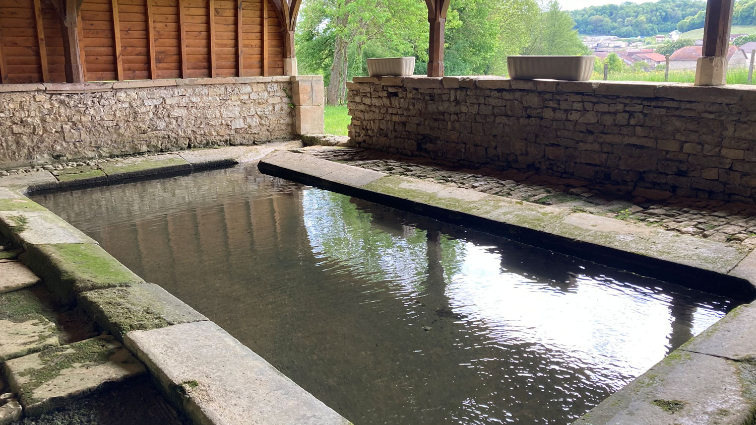 Am Ortsausgang fand ich dann ein kleines Highlight für alle, die sich für Alltagsgeschichte interessieren: Ein halbelliptisches Lavoir aus dem Jahr 1878, eingebettet in eine liebevoll gepflegte Parkanlage. Ursprünglich dachte ich, solche Waschhäuser hätten Pilger genutzt – doch weit gefehlt. Sie waren so etwas wie der Waschsalon des 19. Jahrhunderts, allerdings Zugang nur für Frauen. Kein Wunder also, dass diese Orte schnell zu Treffpunkten für den neusten Dorfklatsch wurden – wahrscheinlich hat genau hier in den Waschhäuser die Redewendung „ …tratschen wie die Waschweiber“ ihren Ursprung.