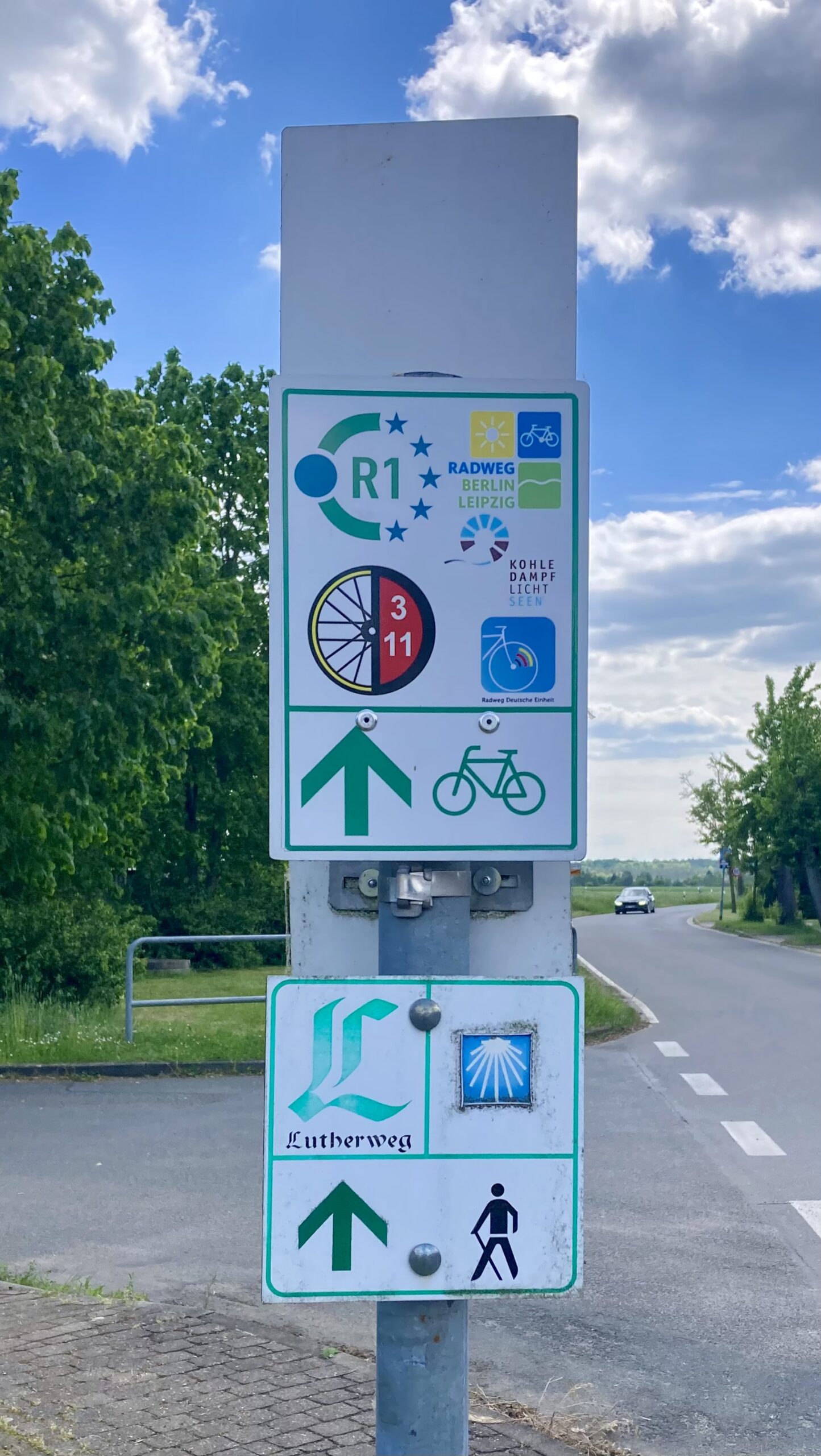Mein Weg führte mich durch eine Mischung aus Jakobsweg, Lutherweg und dem Fahrradweg Berlin-Leipzig. Abgesehen von einem kurzen Abschnitt durch die Elbauen verlief die Route gänzlich auf asphaltierten Radwegen, die sich schnurgerade erst an der B2 entlangzogen, dann entlang der Bahnstrecke und schließlich durch den Wald schlängelten. Ein Paradies für Radsportler, doch für meine Knochen erwies es sich als Herausforderung, da die Dämpfung meiner Schuhe den Unterschied im Untergrund nicht auszugleichen vermochte.