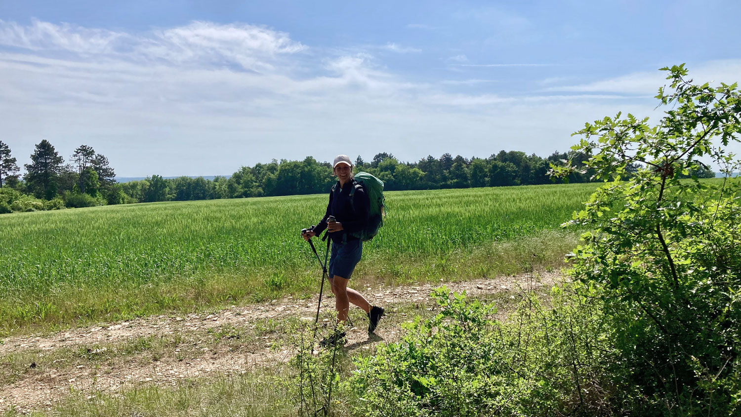 Die Sonne hatte ordentlich Kraft und die Strecke war zum großen Teil schattenlos. Eine kleine Mittagspause legte ich an einem Waldrand ein. Ich hatte Quiche dabei und suchte mir ein halbwegs kühles Plätzchen.
