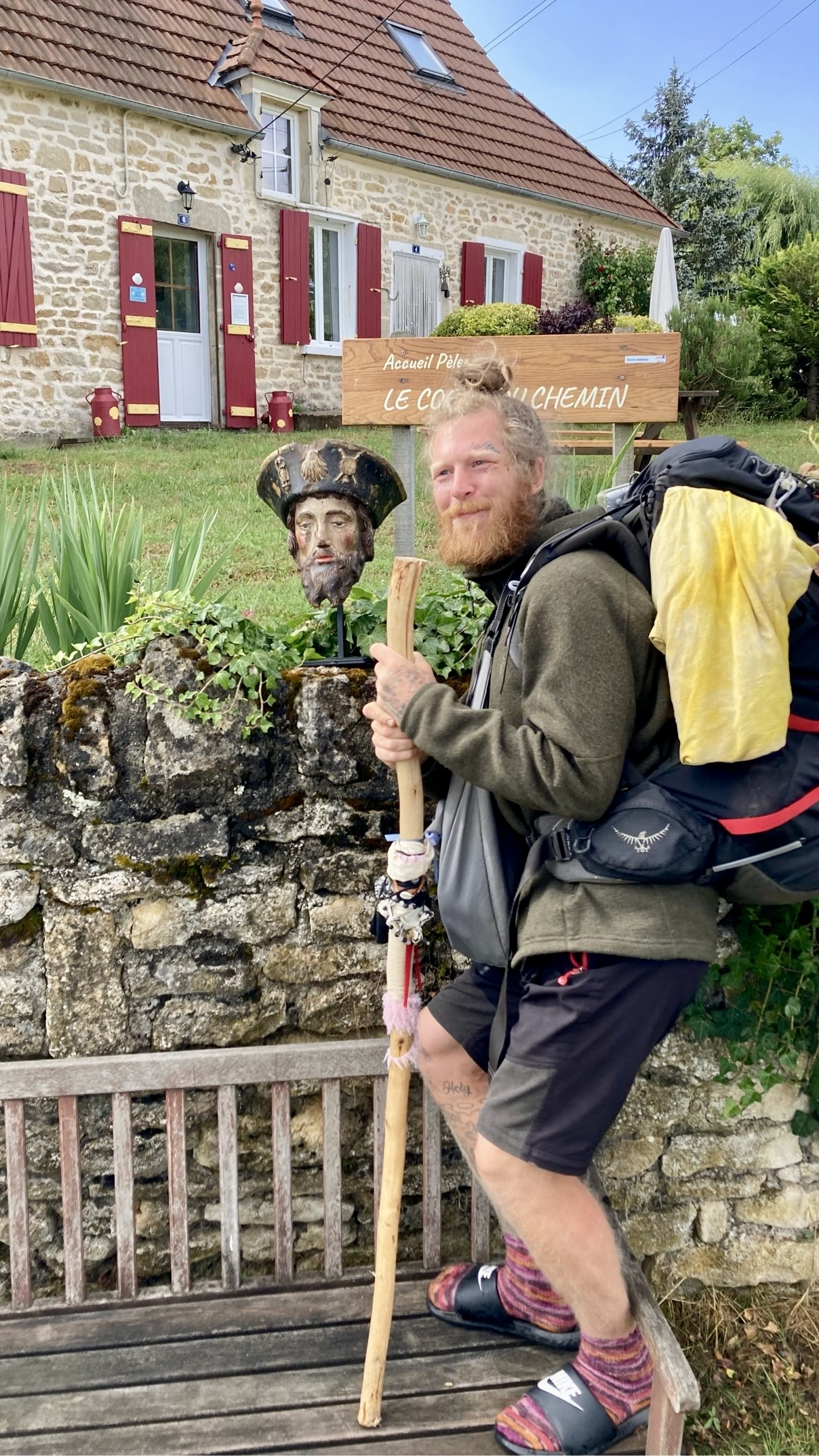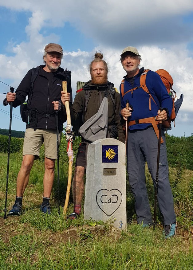 Heute stand Pilgern mit biblischer Begleitung auf dem Plan — oder sagen wir: mit einer äußerst heiligen Erscheinung. Bevor wir überhaupt losliefen, entdeckten wir nämlich, dass unser Mitpilger Daniel eine erstaunliche Ähnlichkeit mit dem Heiligen Jakobus hat. Nur der Hut fehlte noch – aber aus Filz lässt sich ja bekanntlich alles zaubern.